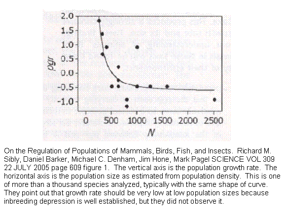 Sibly et al estimated the relationship between a population's size and its growth rate for 1,780 time series of mammals, birds, fish, and insects. Growth rates are high at low population densities but, contrary to previous predictions, decline rapidly with increasing population size and then flatten out, for all four taxa. This produces a strongly concave relationship between a population's growth rate and its size. The fact that the curve is defined by only three values (vertical and horizontal position and degree of curvature) suggests a simple scientific law lying at the very heart of evolution and, we suggest, genetics. We undertook to duplicate the curve with one of two programs we had available that could simulate a population, specify details of its genetic behavior and follow it over generations.