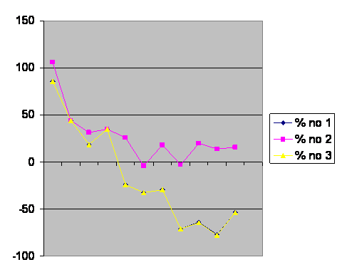 Simply assigning 0 population to the extinct line is “% no 1” on the graph. “% no 2,” dropping the populations that go extinct from consideration, underestimates growth reduction, but is the approach used by the authors. They, too, observed that local populations go extinct in the wild all the time. % no 3 takes the maximum population size, divided by the number of generations it took to go extinct, and winding up with a number lost per generation, subtracting that from the sum of the offspring in the populations that survived. This approach is still not perfect, but does give us a line, % no 3, which is essentially the same as % no 1. Compare with page I.
