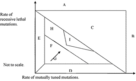 The model accounts for observations, but there are more variables in the model than in reality. There must be some simplifying mechanism. That mechanism is evolution. In the chart A, B, and C are forbidden because the excessive mutation rate would produce extinction. E is not plausible. D we doubt to be possible. F is possible for a finite time, but evolution will increase complexity in the direction of arrow G, until complexity is maximized in H. This is an intrinsic limit to evolution. (In Search of the Limits of Evolution. Fyodor A. Kondrashov NATURE GENETICS: 17: 9 January, 2005) . A subset of H, I, will have the properties we have shown. The fact that evolution must stop in H explains punctuated equilibrium. Evolution starts anew when a form is returned to F because of a favorable change that permits survival with less performance, such as domestication or monogamy. Driving all forms into I reduces the variability that can be observed.
