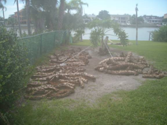 I have been amusing myself pruning a bush. It used to occupy the bare area and then some. The leaves had to be cut. Roots were pulled up and cut. Trash was carried away. And now the thing has been reduced to the trunks. Those on the left have been split. Those on the right await their turn. The remaining trunk I hope to train to go straight up for few years and then curve back to the ground, making a nice arch.