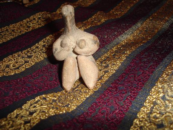 The photograph hardly does her justice. As you can see she is a representation of a woman. She is made of terracotta and her color is warmer than what you see here. There are little lines made of a darker slip painted on her indicating that she is clothed in what appears to be a loose outfit, which is modest enough. She supports her breasts with her arms. Modern women often wear support garments that do the same thing.