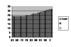 Well it certainly goes as high as 33. It looks like that average age of first marriage goes up a year for every three calendar years.