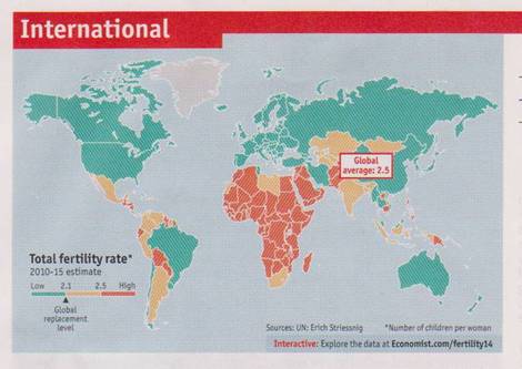 The article starts off reasonably enough pointing out that birth rates are low in the developed world and falling elsewhere. They even have a map:
