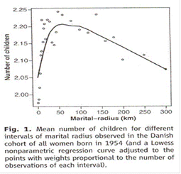 A team led by Labouriau looked at Danish data and compared distance between birthplaces of a couple the number of children they had and found this: