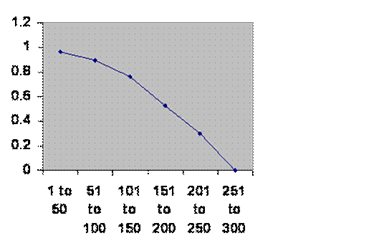 Information taken from John B. Teeple TIMELINES OF WORD HISTORY, DK Publishing, New York, NY, 2006, page 554, 555 Japanese dynasties. The vertical axis is the chance that a dynasty of that age will survive another 50 years. The horizontal axis is the age of the dynasties. Same notch.