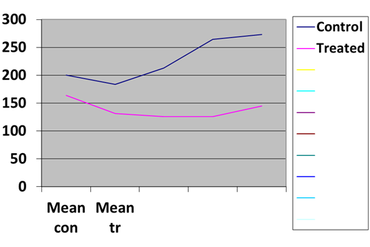 The blue line is the control. Generations lie along the bottom axis, counts are on the verical axis. The line trends upwards. I think that is because the flies had been maintained for years simply by shaking an old vial with flies into a fresh vial. Thus, I suspect, they all suffered from outbreeding depression. During the study, each generation four males and four females were selected to restart each population each generation. This, apparently, released them from the outbreeding depression and raised fertility even five generations later. The red line is the experimental line. To my eye it is lower.