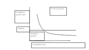Fertility is on the vertical axis and population size – the inverse of kinship – along the bottom. Since this is a sketch rather than real data or the prediction of a theory – which would be a computer result – it is unrealistically clean, but that helps make it clear.
